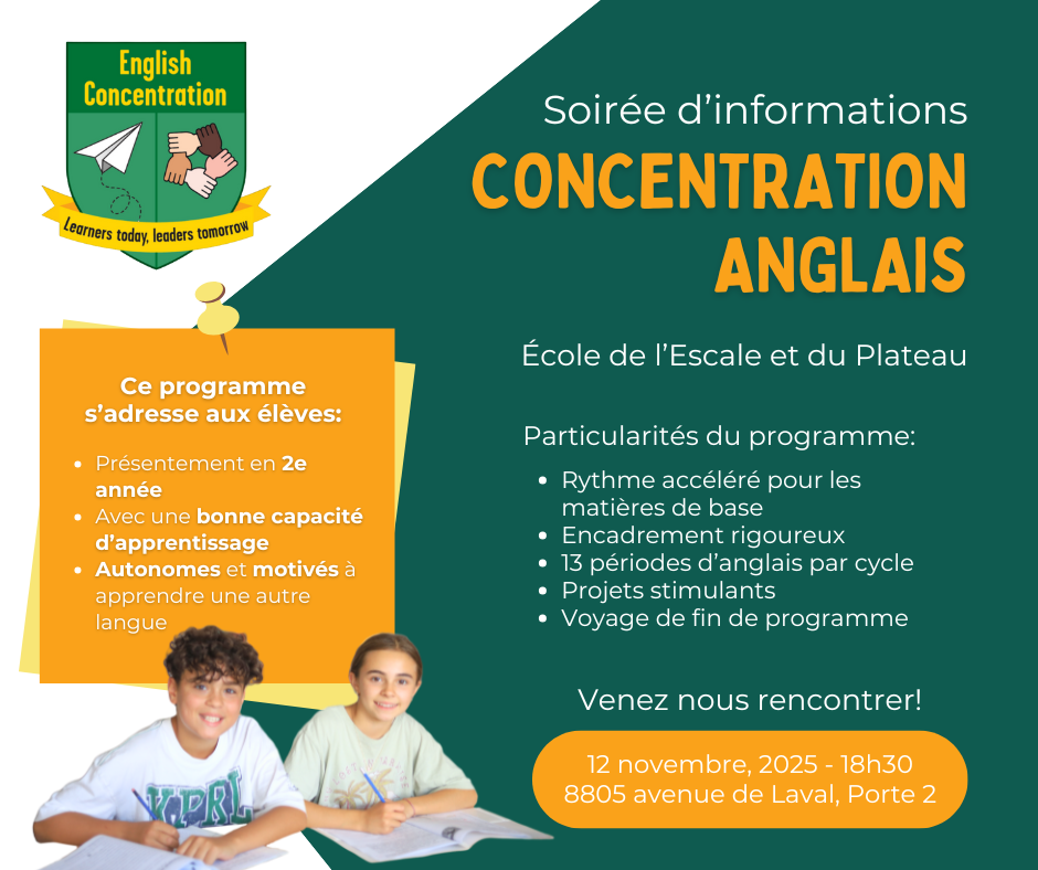 Nous vous invitons à venir rencontrer l'équipe de l'école de l'Escale et du Plateau pour découvrir et en savoir davantage sur la concentration anglais.