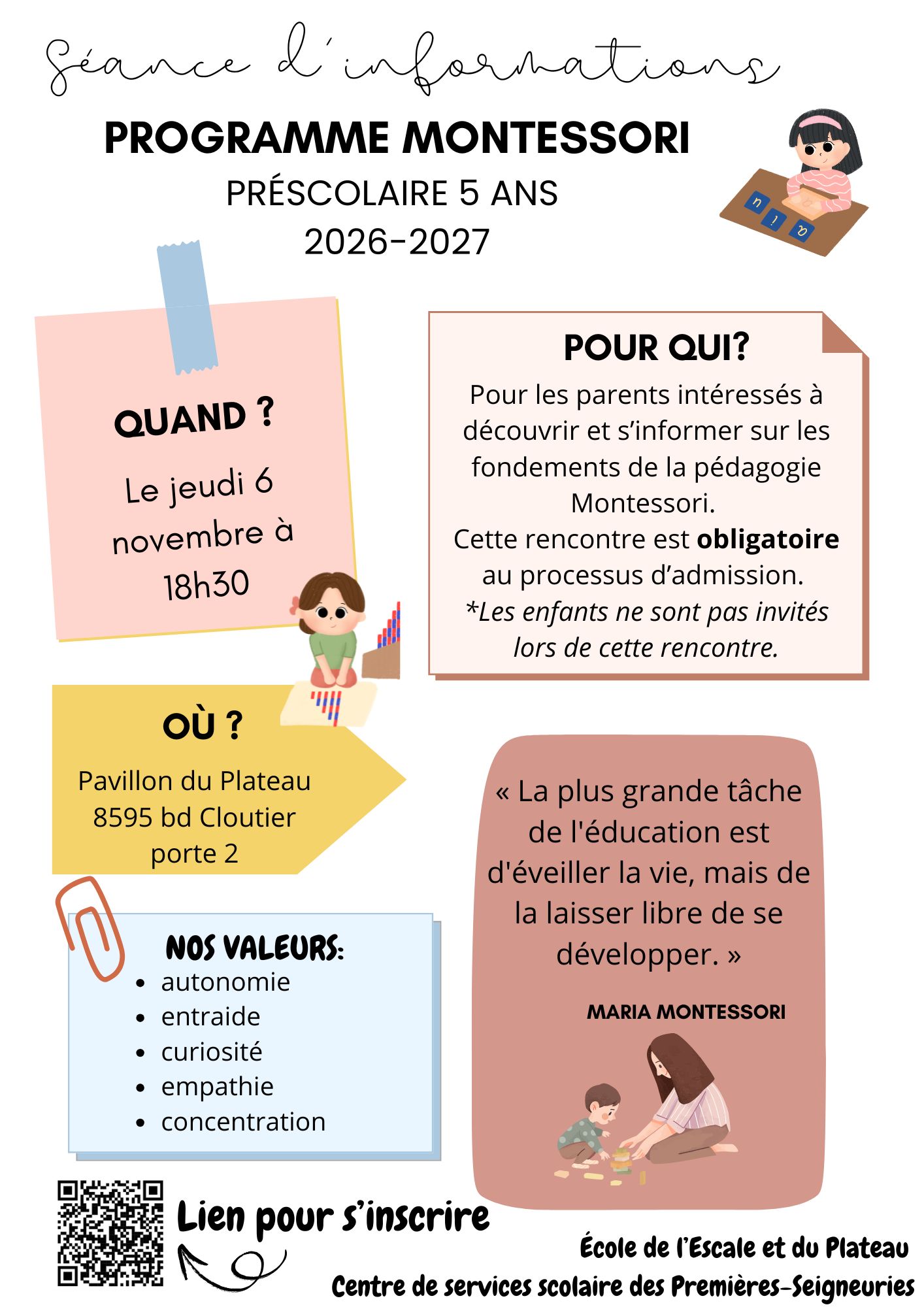 Nous vous invitons à venir rencontrer l'équipe de l'école de l'Escale et du Plateau pour découvrir et en savoir davantage sur le programme Montessori.