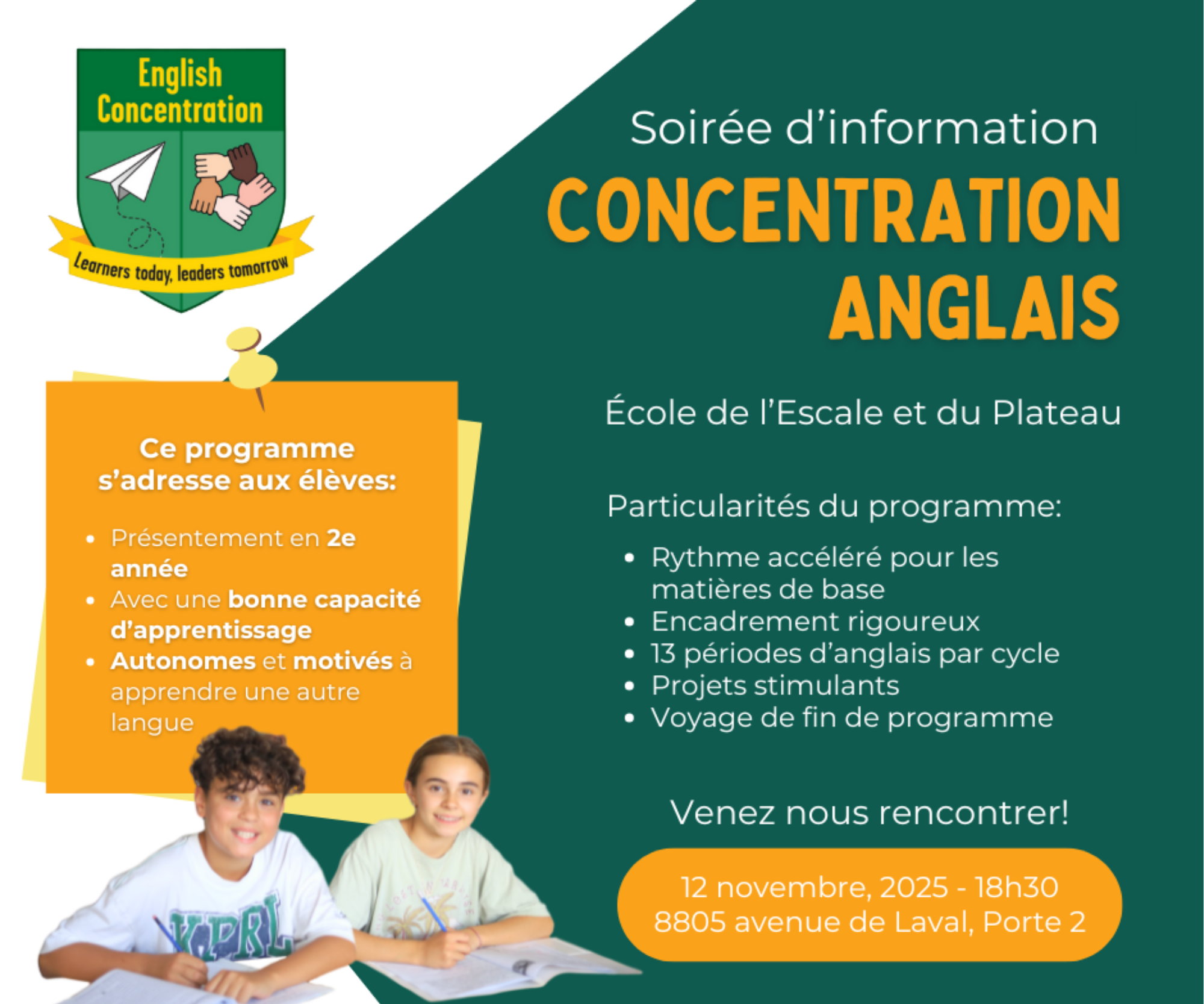 Le programme de Concentration Anglais est un programme de 4 ans offert à partir de la 3e année. Les élèves bénificieront de 13 périodes d'anglais par cycle, pour un total de plus de 1 000 heures à la fin de leur 6e année. Pour conclure ce parcours, les élèves auront la chance de vivre un voyage immersif d'une semaine dans un milieu anglophone. Pour inscrire votre enfant, il est essentiel de vous présenter à la rencontre d'information du 12 novembre 2025, à 18 h 30, afin de connaître toutes les particularités de notre programme.