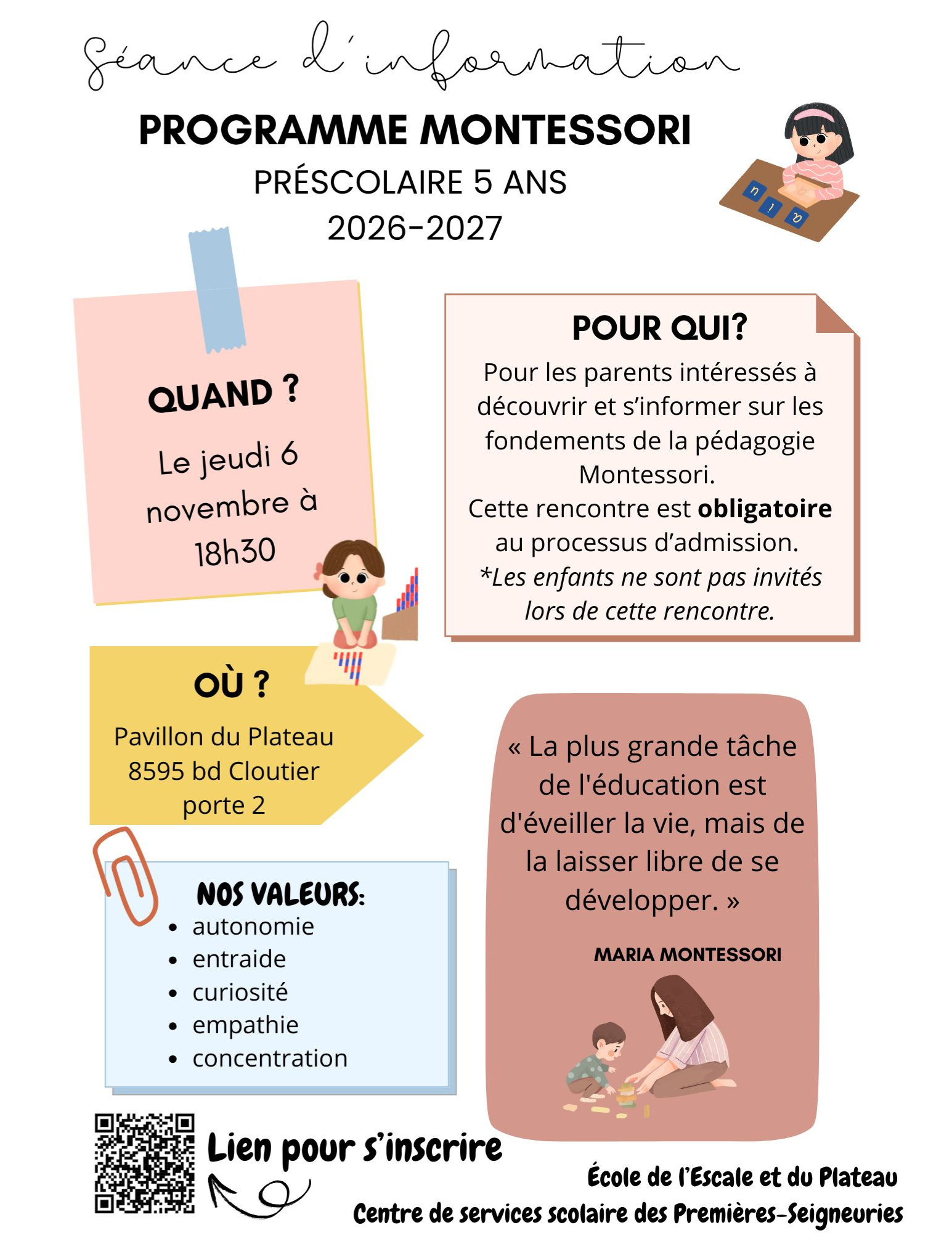 La réunion d'information obligatoire aura lieu le jeudi 6 novembre 2025 à 18 h 30 au bâtiment du Plateau. Les parents doivent se présenter sans enfant à la porte 2.
